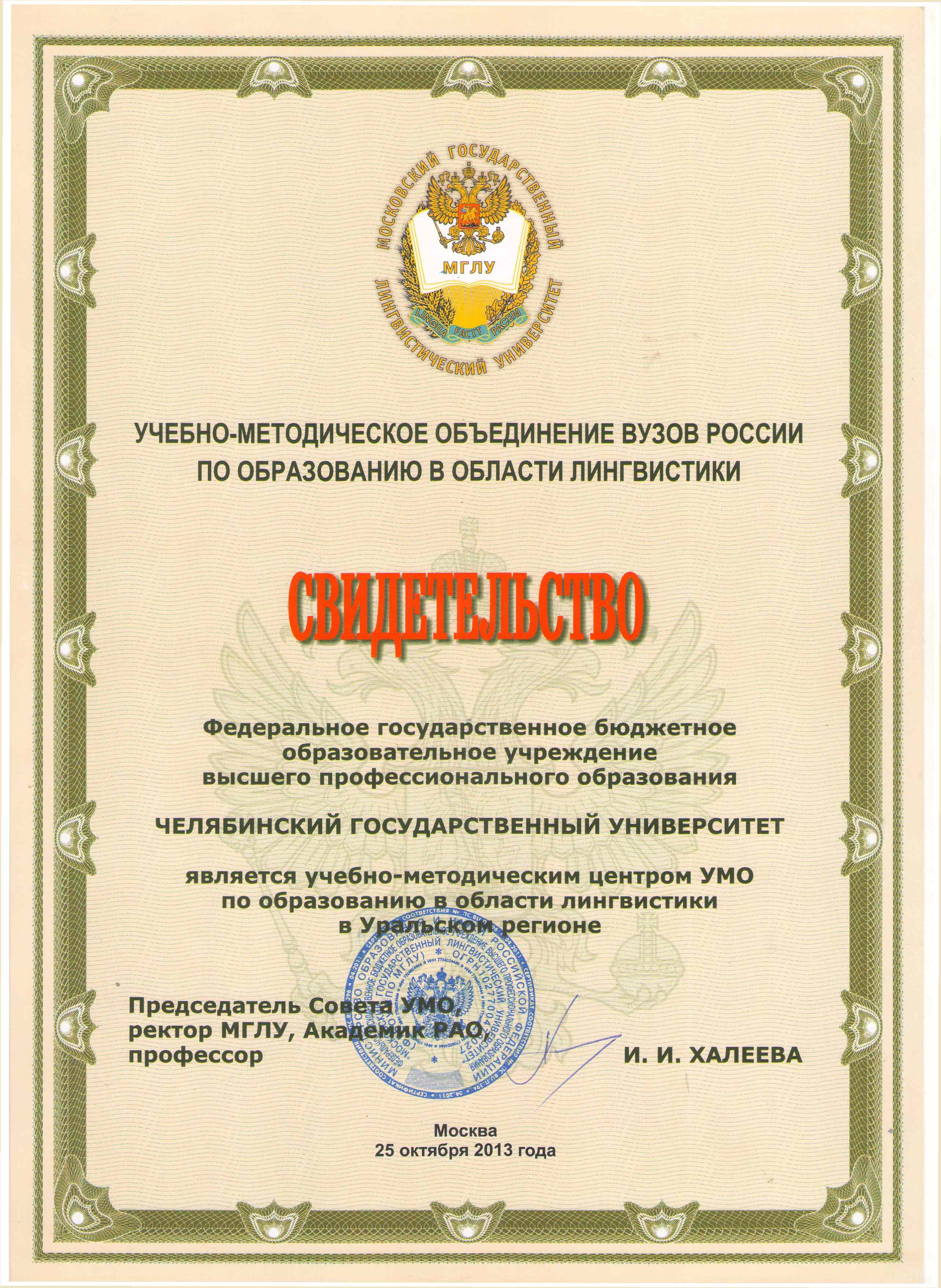 25 октября 2013 на заседании совета УМО вузов России по образованию в области лингвистики было принято решение, согласно которому, к уже существующим четырем Региональным учебно-методическим центрам, созданным на базе Пятигорского государственного университета, Нижегородского государственного лингвистического университета, Иркутского государственного лингвистического университета и Алтайской государственной педагогической академии примкнул вновь созданый на базе Челябинского государственного университета пятый РУМЦ. Он будет координировать работу вузов Пермского края, Ханты-Мансийского автономного округа Свердловской, Курганской, Тюменской и Челябинской областей, в которых ведется подготовка специалистов в области лингвистики.