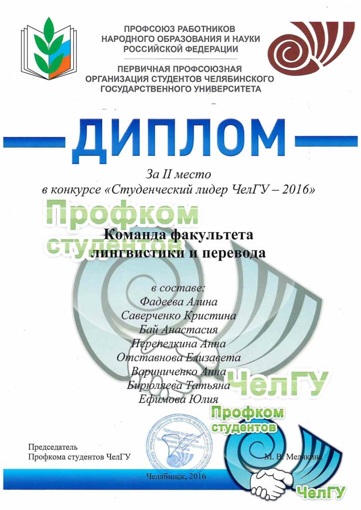 "Факультет лингвистики и перевода за 4 года стал для меня больше, чем просто местом учебы. Команда преподавателей, молодых, студенто-ориентированных профессионалов, дала мне все возможности для изучения языков (английского и немецкого), основ и нюансов перевода, как технической, так и художественной литературы.Поступив на факультет, я столкнулась с проблемой языкового барьера - все понимаю, а сказать не могу. Всего за год мне удалось полностью от него избавиться, благодаря преподавателям и учебному плану, 90% которого состоит из занятий только на иностранном языке.С немецким языком до поступления я была знакома на уровне слоганов автомобильных марок из рекламы. За два семестра нас обучили немецкому уже до уровня А2 (спасибо за это Аделине Гюль-Балаевне Салаховой). Факультет также предоставил мне возможность съездить в Германию на летние языковые курсы по программе DAAD. Лектор которой Кора Маурер вела занятия по немецкому. Эта поездка стала одним из самых ярких впечатлений в жизни.Факультет также помогает студентам, занимающимся научной деятельностью. Огромное спасибо моему научному руководителю, Гаянэ Рубеновне Власян, благодаря которой за время обучения я поучаствовала в четырех научных конференциях, одна из которых проходила в Москве, трижды мои публикации бесплатно печатали в сборниках ЧелГУ (факультет оплачивал все расходы).Кураторы нашей группы организовывали мероприятия вне университета, мы ходили вместе в театры, краеведческий музей, на вечер джазовой музыки, всегда были в курсе "языковых" мероприятий в городе, будь то неделя Германии в кинотеатре "Знамя" или буккроссинг английской литературы в публичной библиотеке.Обучение на факультете лингвистики и перевода стало незабываемым этапом моей жизни. Я надеюсь продолжить его и в магистратуре."